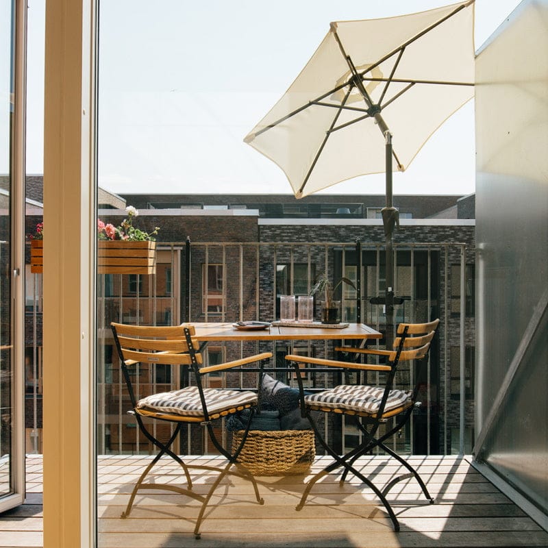 Vårt balkongfeste er en smart og stilren løsning for deg som ønsker parasoll på liten plass. Festes enkelt og sikkert til rekkverk eller gelender – helt uten tunge parasollføtter som tar opp verdifull plass på balkongen.