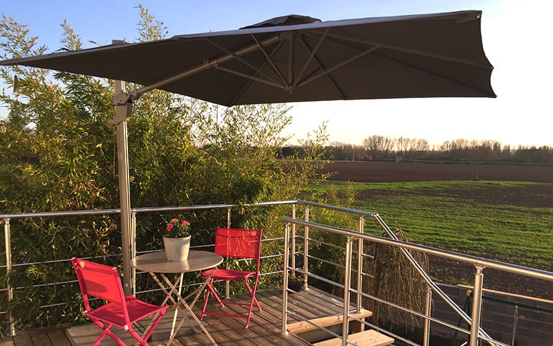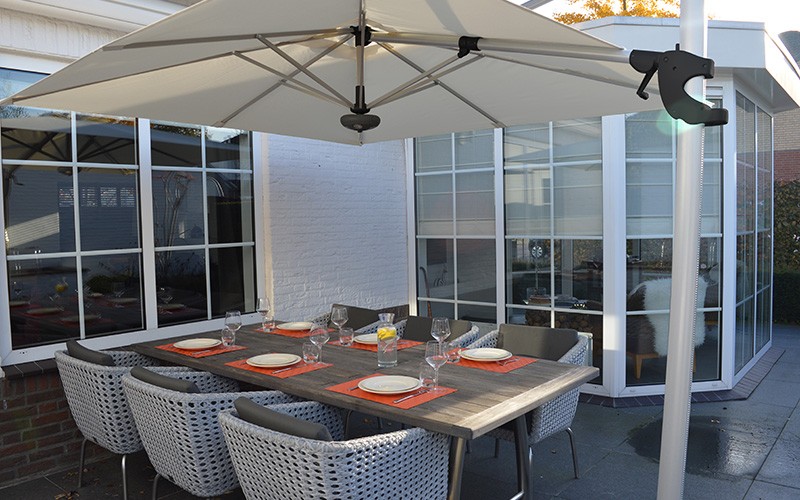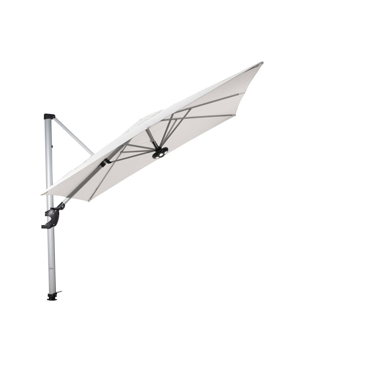 Basen til Cielo-parasollen er utstyrt med en smart dreiemekanisme. Du kan rotere denne hengeparasollen enkelt og i 360 grader ved å trykke på fotpedalen. Ved å slippe denne pedalen vil denne praktiske parasollen automatisk låses i sin posisjon.