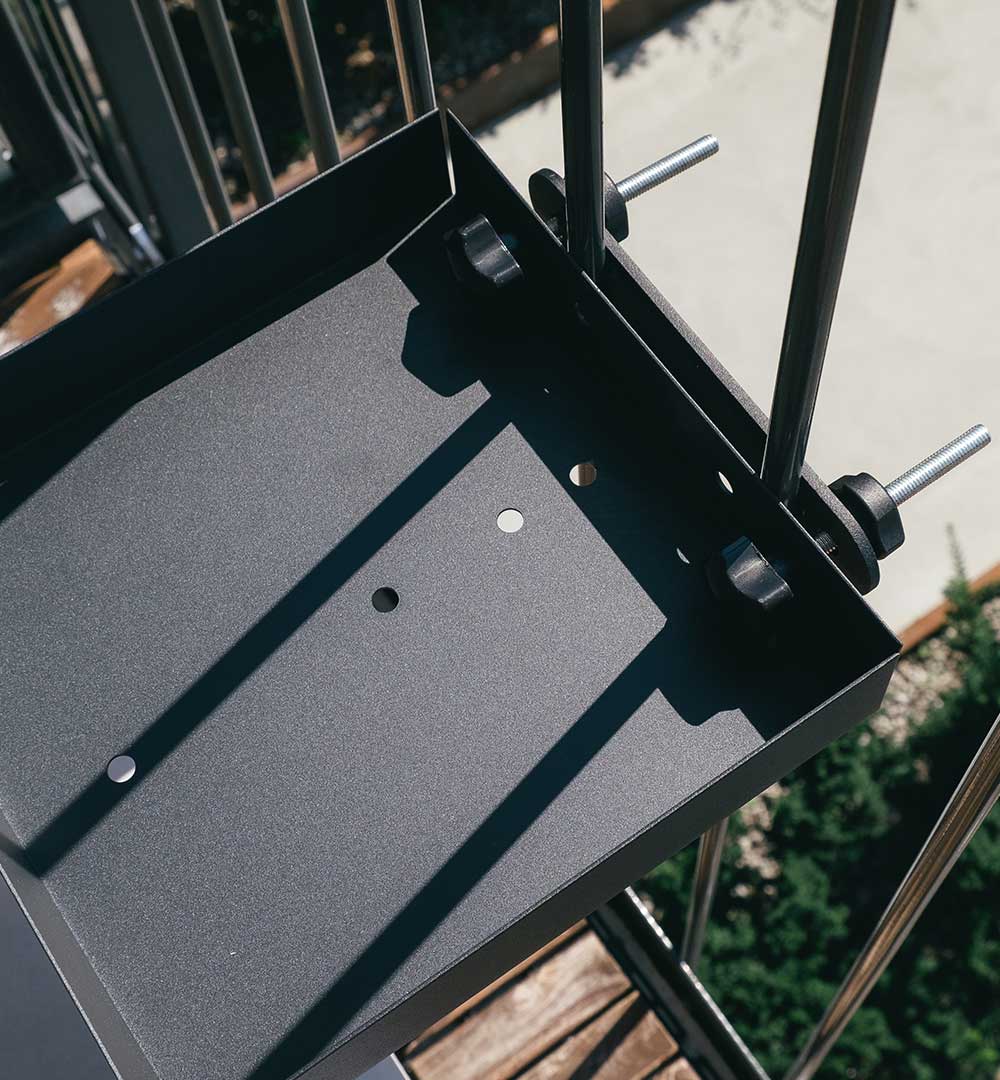 Tray-table fra SMARTfoot Originals festes på balkongrekkverk eller stolper. Tray-Table gir ekstra plass på din balkong. Nyt solen med kald drikke og snacks på Tray-table. Da får du ekstra god plass på din balkong. Tray-table måler 25 x 25 cm. Passer til balkongrekkverk opptil 60 mm tykke. Tray-table er laget i galvanisert stål og pulverlakkert i matt svart.
